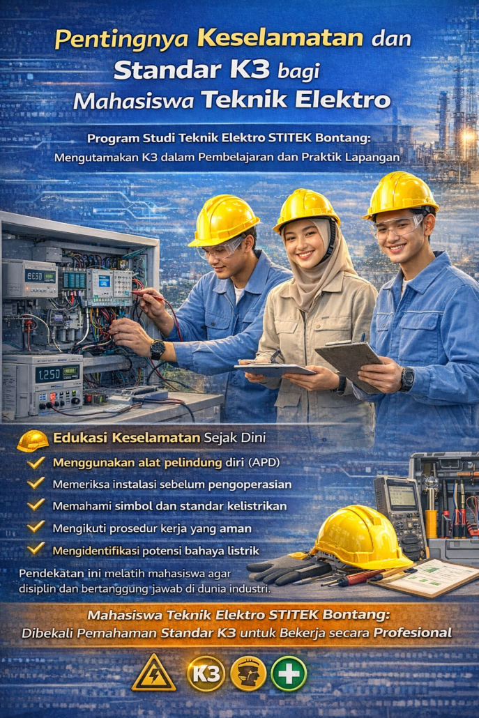 Bontang – Dalam dunia kelistrikan dan industri, keselamatan kerja merupakan aspek yang tidak dapat diabaikan. Risiko sengatan listrik, korsleting, hingga kecelakaan kerja menjadi tantangan nyata di bidang Teknik Elektro. Oleh karena itu, Program Studi Teknik Elektro STITEK Bontang menempatkan aspek Keselamatan dan Kesehatan Kerja (K3) sebagai bagian penting dalam proses pembelajaran.