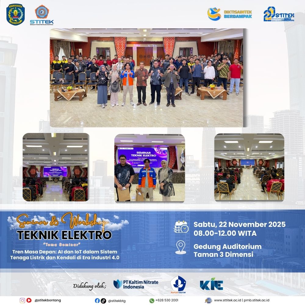 Program Studi Teknik Elektro STITEK Bontang telah sukses menyelenggarakan Seminar dan Workshop Teknologi pada 22–23 November 2025 sebagai bagian dari program peningkatan kualitas akademik dan kompetensi mahasiswa dalam bidang Artificial Intelligence (AI) dan Internet of Things (IoT). Kegiatan ini merupakan implementasi nyata prodi dalam mendukung penguatan kemampuan mahasiswa menghadapi tantangan era industri 4.0.